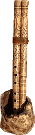 The dvojacka is more complicated to make than either a single koncovka or pístalka. Two tubes are shaped from a single piece of wood with bores cut into each. The ends of the tubes are then plugged and fipples are created. The player must be able to blow through both at the same time. The whistle side (usually on the player's left) has six finger holes cut into it. The word dvojca means twin, and the instrument called dvojacka looks like it is made of matching twin flutes. The decoration of the dvojacka is typically the same on each side. The koncovka side has the shape of six finger holes carved or colored onto it, while Slovak Name: Dvojacka, read [dvojatschka], means double whistle. |